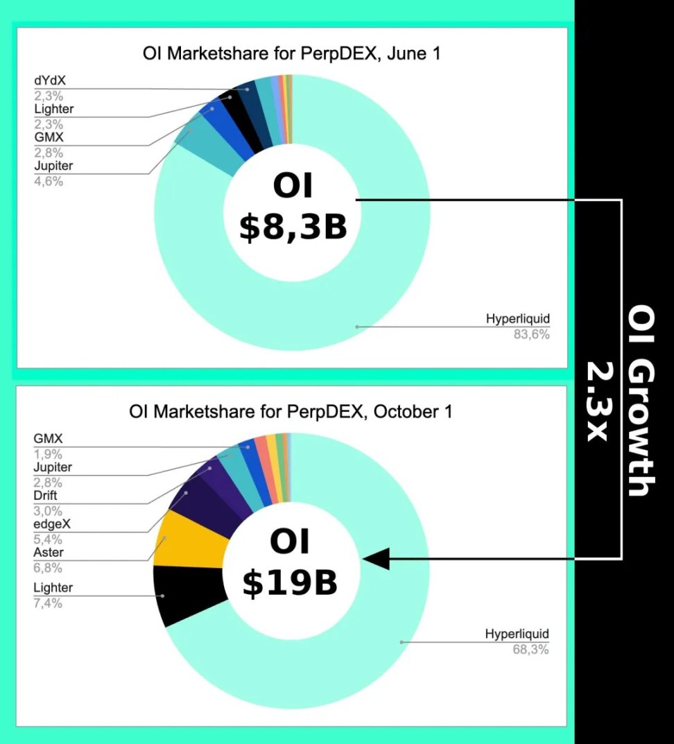 即使在 Aster 开启 Perp DEX war 最热的十月初,Hyperliquid 的市场份额也只下降 15% 左右,而 Volume 则被 Aster 反超好几倍,也说明 CLOB 价格机制引发规模效应,进而导致的流动性主要是指持仓量,而不是交易量。