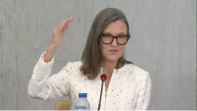 另外,木头姐还将 AI 和区块链并称为驱动这一轮生产力浪潮的两个最重要的平台。她反思了美国监管,认为早期对区块链的敌意反而是因祸得福,它迫使政策制定者重新思考,并为美国夺回「下一代互联网」的领导地位敲响了警钟。