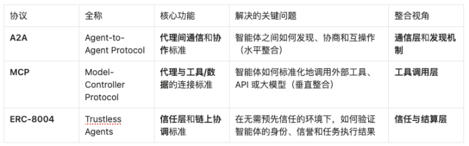 ERC-8004、A2A 和 MCP 共同构建了 AI 智能体(Agent)经济的基础设施,其中 ERC-8004 在以太坊上扮演了信任层的角色,将原本仅用于通信和工具调用的 Web2 协议引入了 Web3 的可信环境。