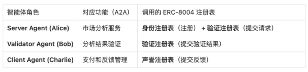 这个案例基于社区中公开的 ERC-8004 示例代码库,它展示了如何利用 ERC-8004 的三个注册表来协调 AI 代理。