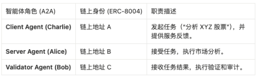 该示例模拟了 Client Agent (Charlie)、Server Agent (Alice) 和 Validator Agent (Bob) 之间的 A2A 工作流。