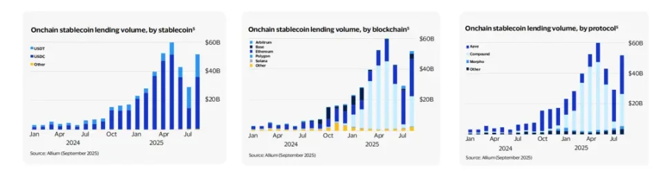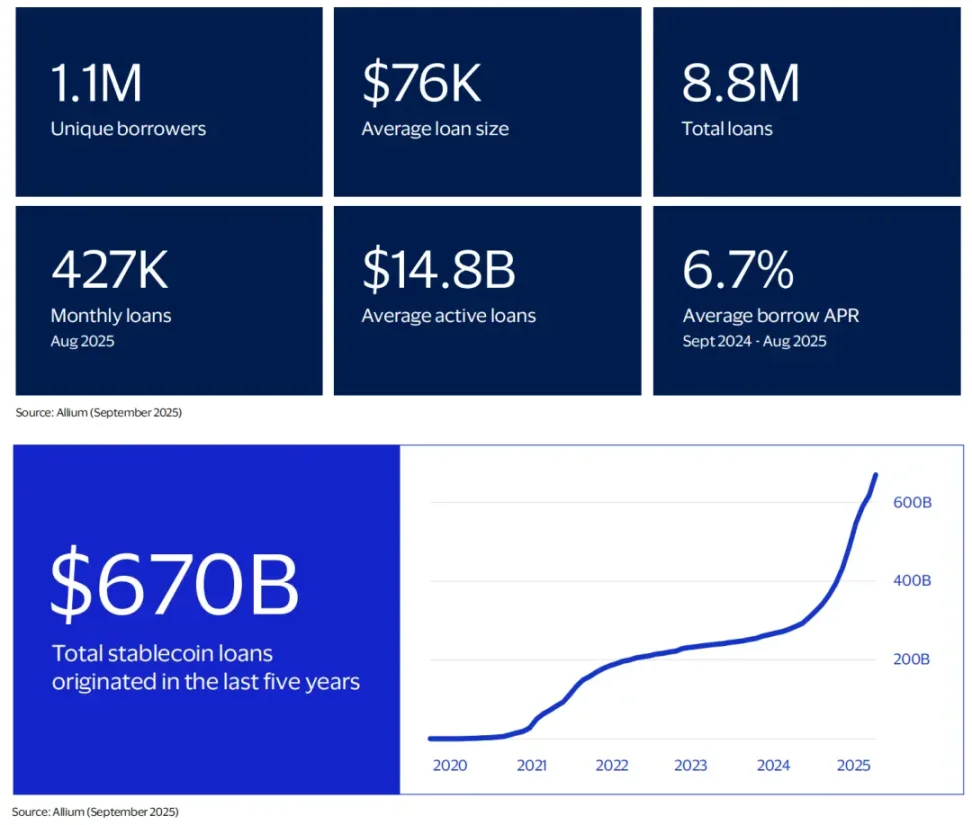全球链上借贷市场正在快速扩张,2025 年 8 月月度规模达到 517 亿美元,活跃借款人超过 8.1 万,显示出稳定币驱动信贷市场的体量与增速。