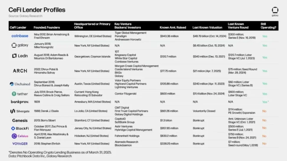 下图对比了历史上一些规模最大的 CeFi 加密贷款机构。部分公司为投资者提供多种服务,例如 Coinbase,其主要业务是交易所,但也通过场外加密货币贷款和保证金融资向投资者提供信贷服务。