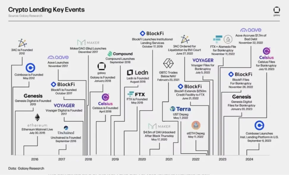 尽管链上和链下加密借贷直到 2019 年底 /2020 年初才被广泛使用,但一些当前和历史上重要的参与者早在 2012 年就已成立。其中,Genesis 尤其值得关注,其贷款规模曾高达 146 亿美元,成立于 2013 年。像 Aave、Sky(原 MakerDAO)和 Compound Finance 这样的链上借贷巨头,于 2017 年至 2018 年在以太坊上推出。这些链上借贷 / 借贷解决方案的出现,得益于以太坊和智能合约的诞生,而以太坊和智能合约于 2015 年 7 月正式上线。