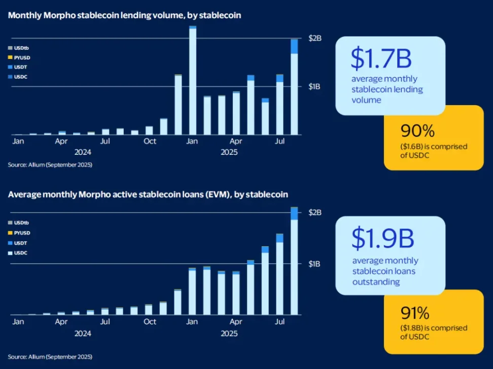 目前,Morpho 每月稳定币借贷量达 17 亿美元,未偿稳定币贷款为 19 亿美元;其中 USDC 占借贷量 16 亿美元(90%)、未偿贷款 18 亿美元(91%)。与 Coinbase 的合作是这一 USDC 活动的最大推手:通过 Coinbase 集成,Morpho 已促成逾 10 亿美元 USDC 贷款发放,抵押品为超过 12 亿美元的 cbBTC。