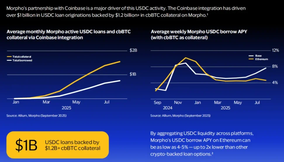 通过跨平台聚合 USDC 流动性,Morpho 在以太坊上的 USDC 借款年化收益率可低至 4–5%,较其他加密抵押贷款选项低约一半。