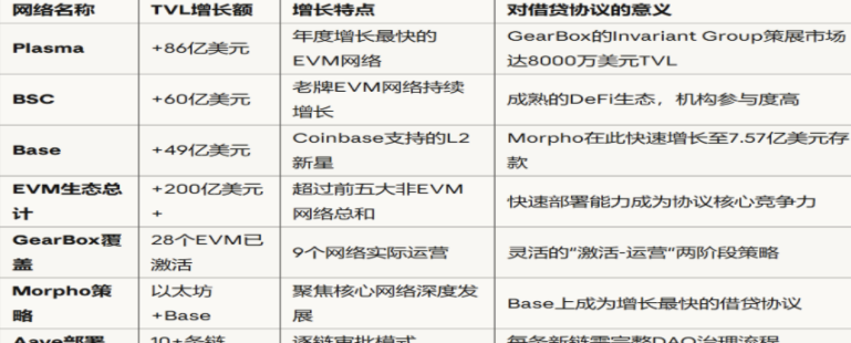 与此同时,风险策展人 (Risk Curator) 这个群体在过去一年规模增长了 20 多倍。这些人不是开发者,也不是 DAO 成员,他们就是专注于某类资产风险管理的专业人士。他们对特定市场的理解可能比任何 DAO 投票出来的参数都要精准,但在传统模式下,他们没有施展空间,因为所有决策都得走 DAO 流程。网络层面的变化也值得一提,过去一年增长最快的几个网络——Plasma 涨了 86 亿美元,BSC 涨了 60 亿,Base 涨了 49 亿——有个共同点,都是 EVM 兼容的。整个 EVM 生态去年新增了 200 多亿美元 TVL,比前五大非 EVM 网络加起来还多。对协议来说,如果不能快速部署到这些新兴 EVM 上,那就意味着错过增长机会。