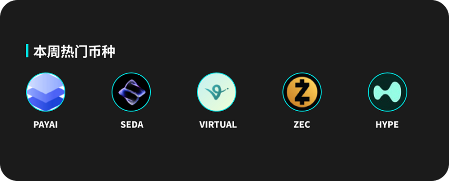 热门币种方面,PAYAI、SEDA、VIRTUAL、ZEC 和 HYPE 都有着不俗的表现。PAYAI 本周价格上涨 1141.6%。SEDA 价格上涨 167.4%。VIRTUAL 价格上涨 90.9%,24 小时交易量 0.6B。ZEC 和 HYPE 本周分别上涨 43.2% 和 27.6%。