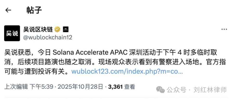 吴说报道,Solana Accelerate APAC 深圳站活动因警方介入而临时提前结束,后续项目路演被叫停,Solana 基金会主席 Lily 当时也在现场。