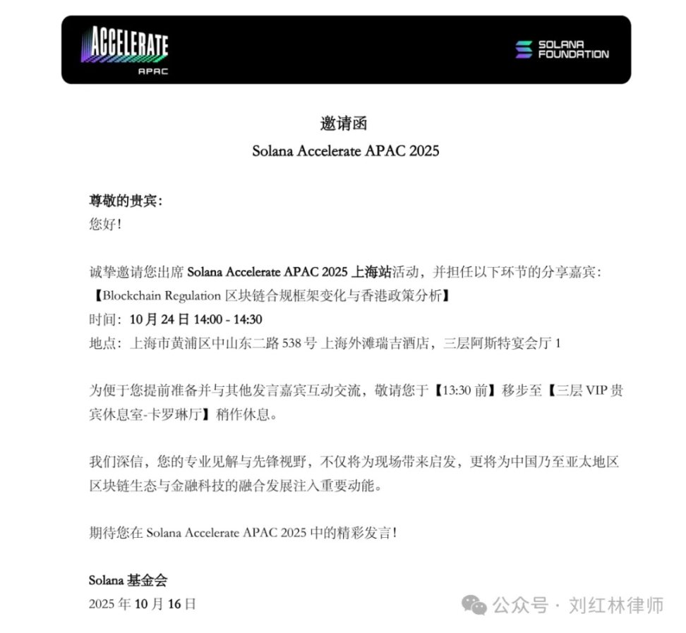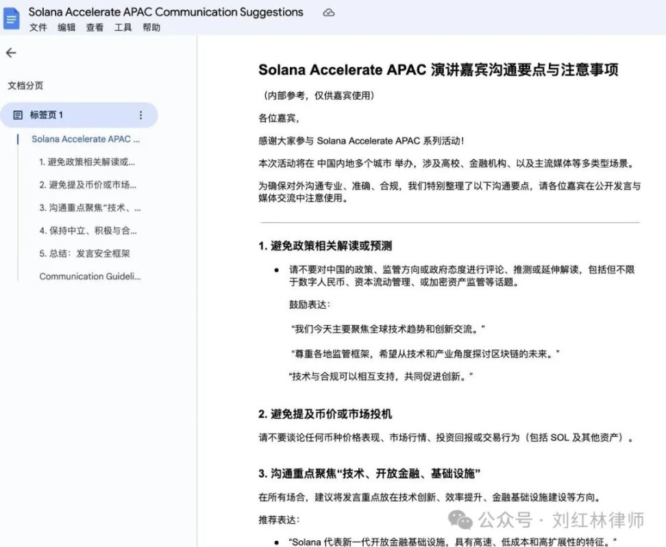 从行业法律合规从业者的视角,红林律师认为 Solana 线下活动和演讲嘉宾的沟通方式与合规文件,值得行业每一个举办活动的从业者学习,它把活动沟通的五个关键边界讲得很清楚,也正好总结出如何在中国合法、健康地开展 Web3 交流。