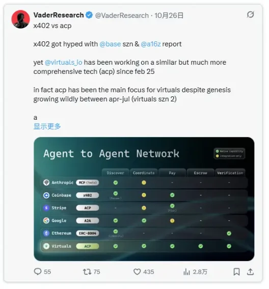 近期,x402 协议成为市场热议焦点。以下将通过对比分析展示 ACP 协议的优势,并阐释 Virtuals 平台如何在这场智能体能力浪潮中占据有利位置: