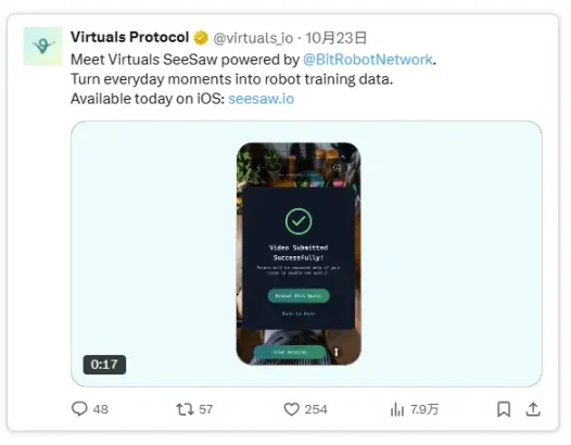 只要奖励机制与用户贡献度匹配,SeeSaw 平台便能快速扩展规模,为 Virtuals 构建起海量的视觉交互数据库,可向所有机器人研发团队提供服务化输出。