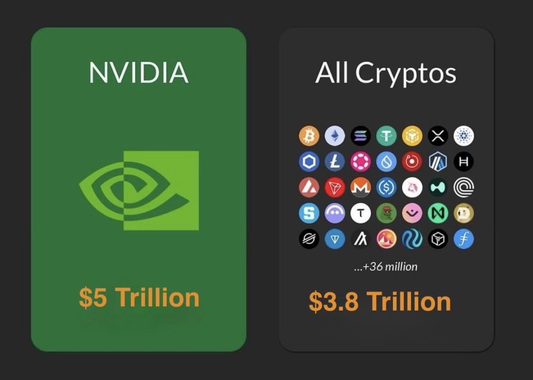 昨夜,美股上演历史性时刻。科技巨头英伟达市值突破 5 万亿美元,书写资本传奇。而这一刻,却让币圈彻底「破防」了。