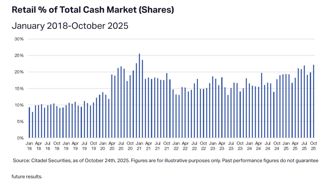 数据也印证了这一热度。纳斯达克数据显示,仅在 2025 年上半年,美国散户投资者累计买入约 3.4 万亿美元股票,卖出约 3.2 万亿美元,交易总额超过 6.6 万亿美元。而根据全球知名做市商 Citadel Securities 分析,散户如今占美股整体交易量的 22%,创下自 2021 年「迷因股狂潮」以来的最高水平。目前散户平均每天交易量高达 12 亿股。