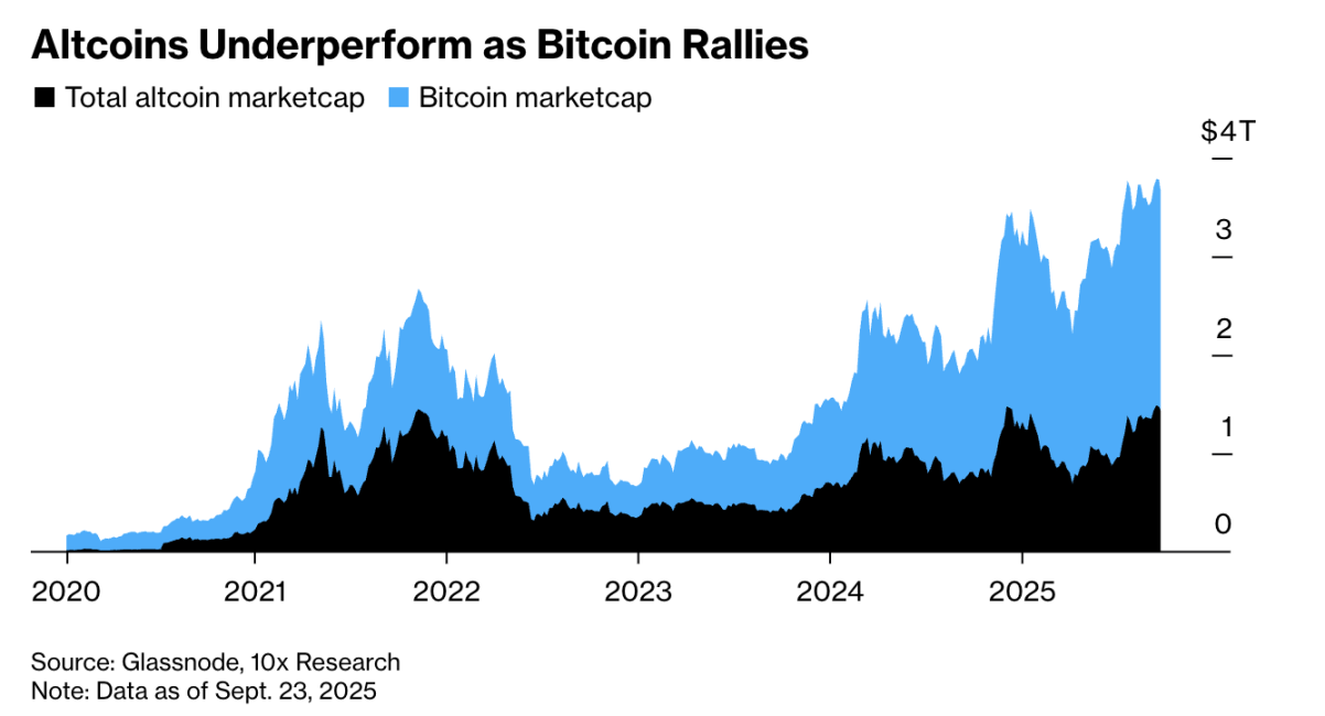 与此同时,部分资金也在流向加密概念股。据彭博社报道,多年来,比特币和山寨币的总市值大多同步变动,但这次情况不同,比特币在机构投资者中日益受欢迎,再加上投机资金转向与加密货币相关的股票,比特币和山寨币之间存在近万亿美元的差距。10x Research CEO Markus Thielen 表示,若散户投资者(尤其是韩国散户)没有将注意力转向相关股票,山寨币总市值本应多出约 8000 亿美元。但在当前周期内,山寨币缺乏新资金流入,且这一缺口短期内难以弥补。而历史上韩国加密交易者偏爱山寨币,当地交易所其交易量占比曾超 80%,全球平台则以比特币和以太坊为主。