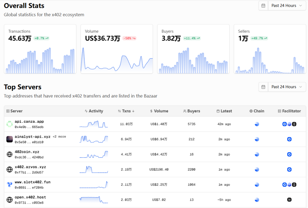 在基础设施层面,x402 协议选择了最简化的切入点:通过 402 状态码与 HTTP 深度兼容,开发者只需“一行代码”即可为网站或 API 赋能支付功能。这种极简接入逻辑不仅降低了中小开发者的门槛,也让大型平台在探索阶段无需承担巨大迁移成本。Coinbase 和 Cloudflare 提供的中间件、客户端库、多链适配器等组件,进一步降低了开发和维护成本。特别是多链适配器的存在,使得服务提供商能够根据实际场景选择最优的区块链执行环境,比如在低成本高并发需求下使用 Polygon,在高安全性场景下使用以太坊主网,或者在 Coinbase 自有的 Base 链上实现与交易所体系的深度整合。这种灵活性意味着协议的普适性大大增强,从而提升了它成为事实标准的可能性。在平台层面,Coinbase 推出的 x402 Bazaar 是最早具备生态雏形的应用场景。这个面向 AI 代理和开发者的市场平台,允许服务提供商将自己的 API、数据源或功能模块列出,用户或 AI 代理则可以按需调用并通过 x402 协议即时支付。其价值在于解决了 API 经济中长期存在的计费与对接难题。以往 API 货币化往往需要复杂的注册、订阅和月结流程,而在 x402 Bazaar 环境中,调用即支付、支付即结算,微支付的属性让按次计费成为现实。对于 AI 代理而言,这意味着它们能够自主、灵活地调用市场上的各类服务,而无需依赖人类手动授权或绑定信用卡。这一市场机制与 AI 代理的自主性高度契合,也为 Coinbase 和 Cloudflare 展示了一个极具潜力的增长点。如果 x402 Bazaar 能够积累足够的供给和需求,它很可能演变为“AI 代理经济的 App Store”。