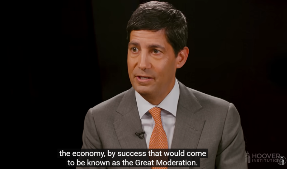 你已经用了这个词几次了。让我们定义一下。「大稳健」时期始于 80 年代中期,当时沃尔克和美联储,可以说是在罗纳德·里根任内,真正将通胀降到较低的个位数,并且通胀一直保持在那里,经济持续扩张,直到 2008 年危机,中间只有几个季度的衰退,持续了大约四分之一个世纪。我说得对吗?这就是你所说的「大稳健」吗?