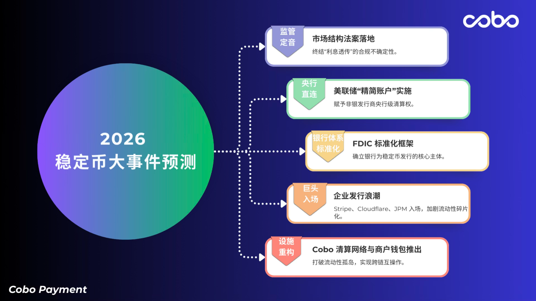 这注定了基础设施必须走向专业分工。以 Cobo 为例,通过将复杂的风控、合规与清算能力封装为标准化 API,让 Fintech 巨头无需触碰高风险私钥或监管红线,即可直接调取区块链的秒级清算优势。这种抽象化处理是规模落地的关键。当用户界面显示的是美元入账,而底层实则由 USDC 完成结算时,稳定币才真正像 TCP/IP 协议一样,完成了从前台工具到后台基建的隐身与进化。