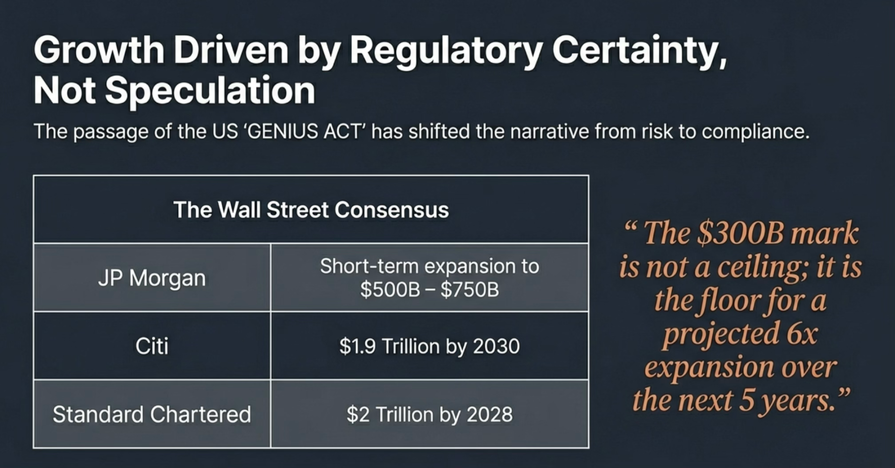 监管定调打开市场预期。这一增长不再受投机情绪驱动,而是由《GENIUS ACT》等法案带来的监管确定性支撑。美国 《GENIUS ACT》 等法案的实质性进展,让花旗、渣打、摩根大通等华尔街巨头达成了万亿级市值的长期共识。