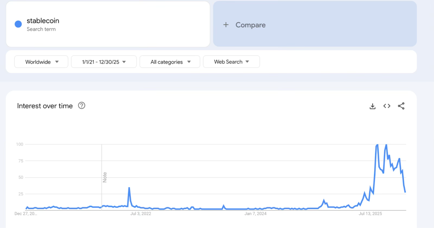 搜索热度的持续攀升反映了认知门槛的降低。当 「stablecoins」作为关键词开始被频繁、持续搜索,意味着稳定币正脱离脱离小众语境,进入日常应用查询阶段。