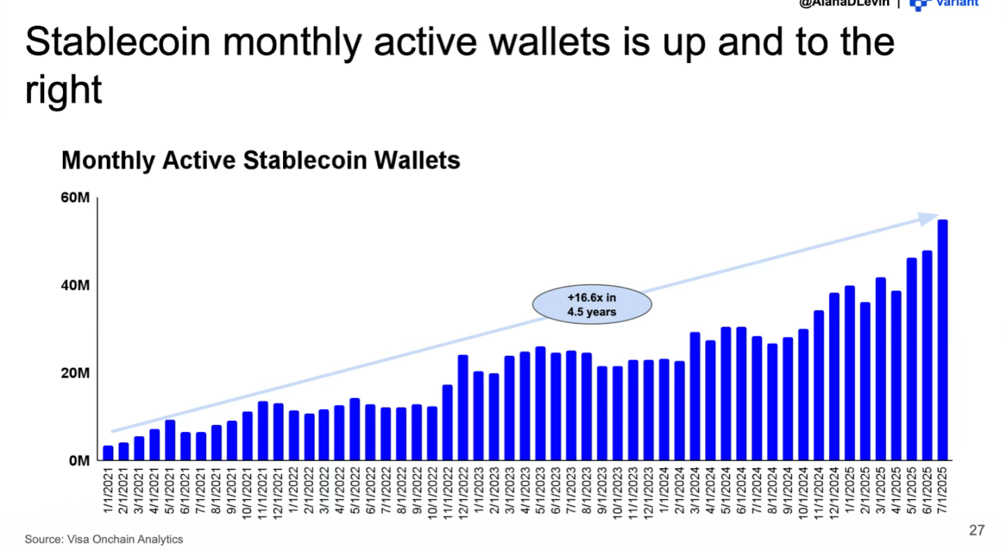 2025 年,稳定币供应量突破 $300B,月度链上转账规模一度接近 $4T。但这一层面的数据,已无法被视为真实采用的指标。