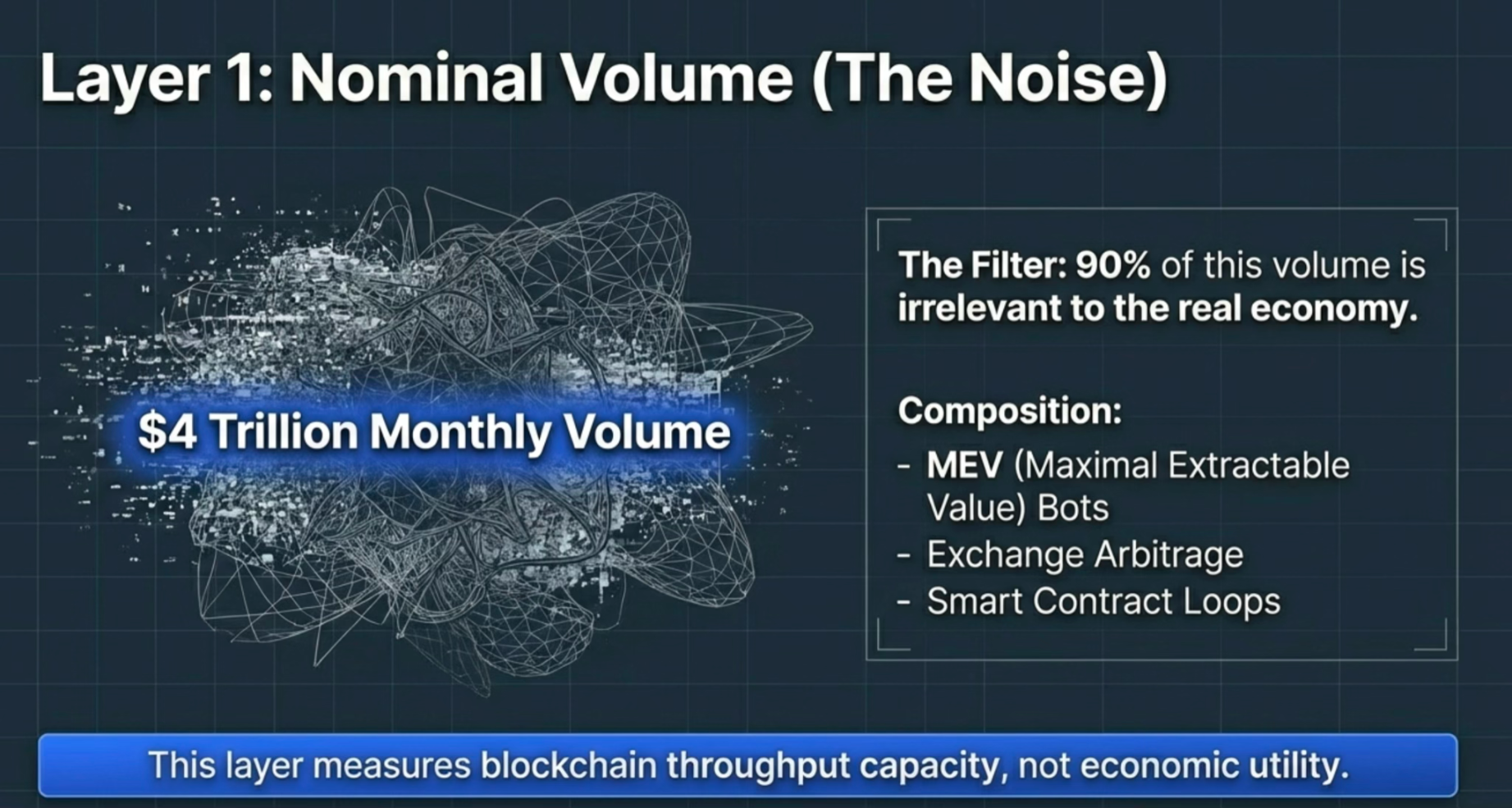下面通过三层过滤,对月度约 $4 万亿美元的稳定币转账额进行系统性清洗,以区分网络吞吐、金融周转与真实支付。