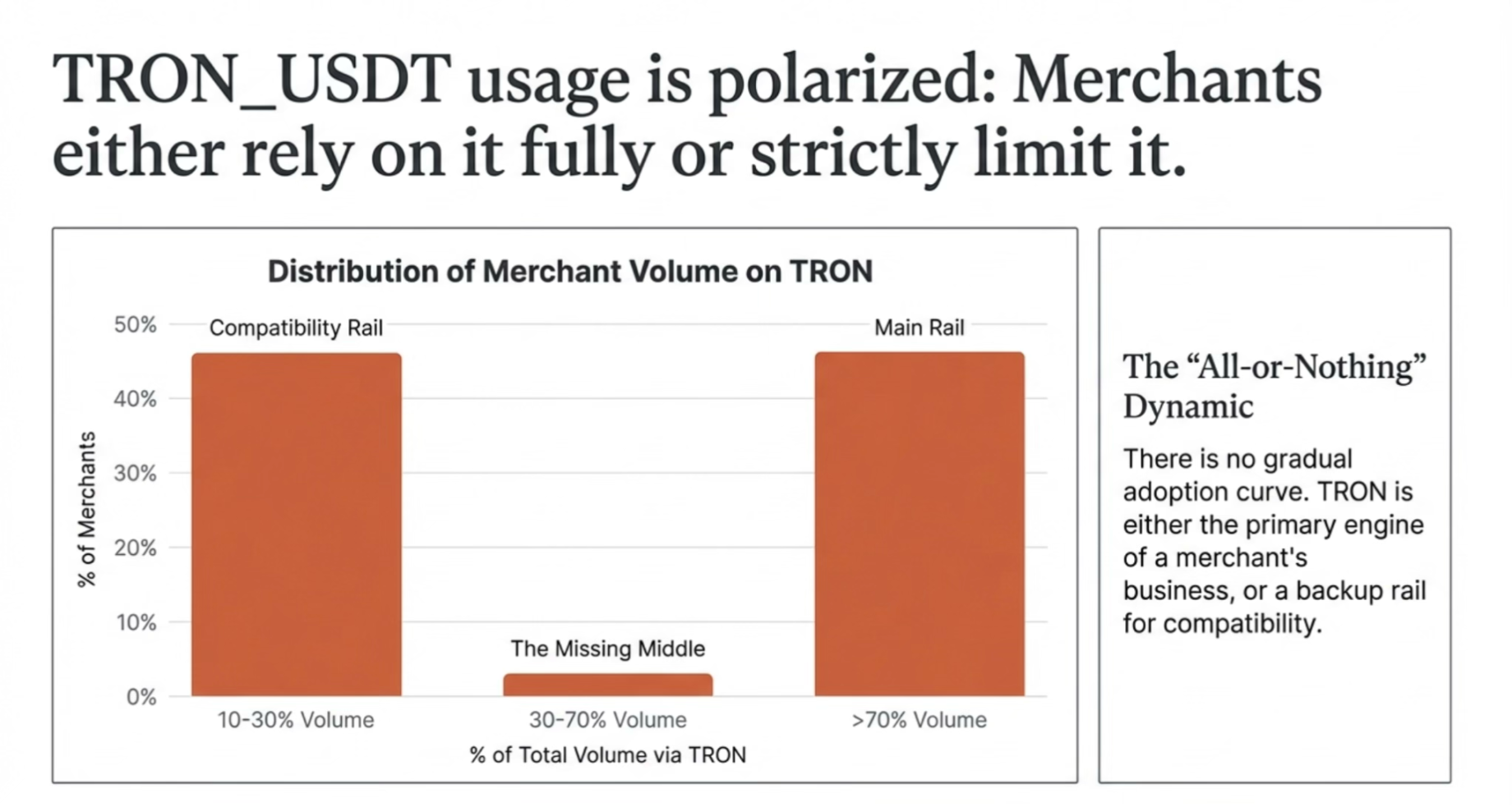 基于 Cobo 的部分客户样本(其中 PSP 占比超过 50%,且 90% 的用户群体集中在亚洲及发展中国家),可以看到稳定币在实际收单场景中的使用并未呈现单向集中,而是形成了明显的分层结构:约 46% 的商户将其作为主力结算轨道(占比 70% 以上),另有约 46% 的商户仅将其作为兼容性通道(占比 10%–30%),而 30%–70% 的中间过渡区间占比极低。这一分布表明,TRON_USDT 是在不同支付条件下被整体启用或有限兼容。
