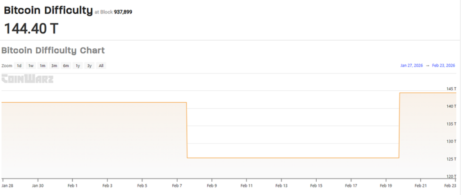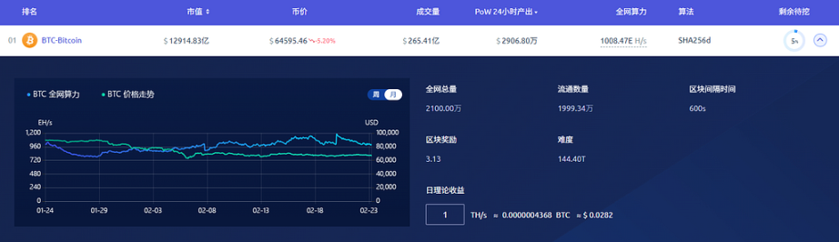 根据这两天的数据,比特币网络难度在 2 月 19 日当天从 125.86T 飙升到 144. 39T,难度涨幅达 14.72%。这是自 2021 年 5 月以来的最大单次上调幅度。这次难度调整直接抹平了矿工在今年早些时候获得的所有运营喘息空间。网络难度的剧增意味着矿企需要投入更多的算力和电力成本,才能维持原有的产出份额。