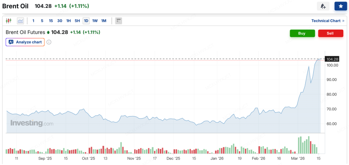 上周,全球传统金融市场遭遇了显著的避险情绪冲击。地缘政治层面,伊朗局势剑拔弩张甚至濒临冲突边缘,市场对全球供应链断裂与能源危机的担忧骤升。布伦特原油价格强势突破并站稳 100 美元 / 桶关口,且呈现持续攀升态势。能源价格的飙升,直接唤醒了市场对二次通胀的深度恐惧。
