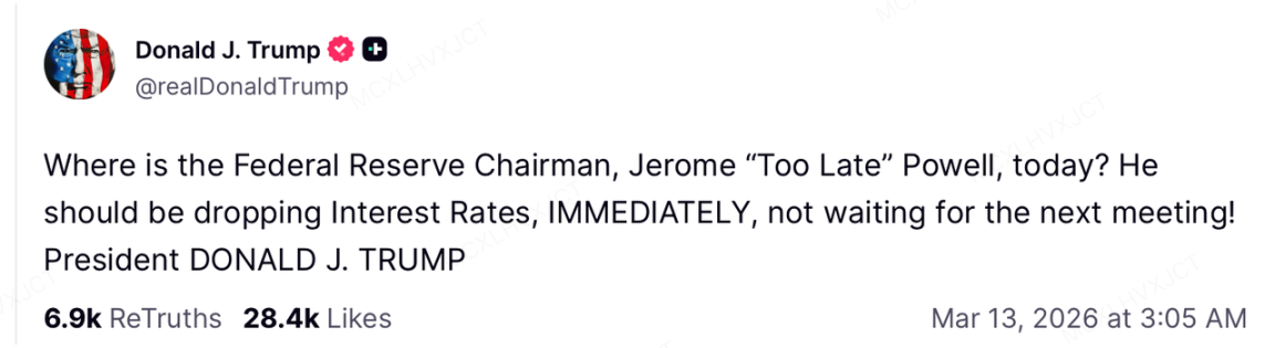 在快速攀升的油价引发的滞胀担忧之外,美联储正面临空前的政治干预压力,这使得未来的降息路径演变成了一场高度复杂的多方博弈。3 月 13 日,美国总统 Trump 在社交媒体 Truth Social 上公开发文,以极其强硬的口吻要求美联储“立即下调利率,绝对不能拖延到下一次会议!”CME FedWatch 显示,市场对 6 月降息的概率押注已暴跌至 25% 以下。