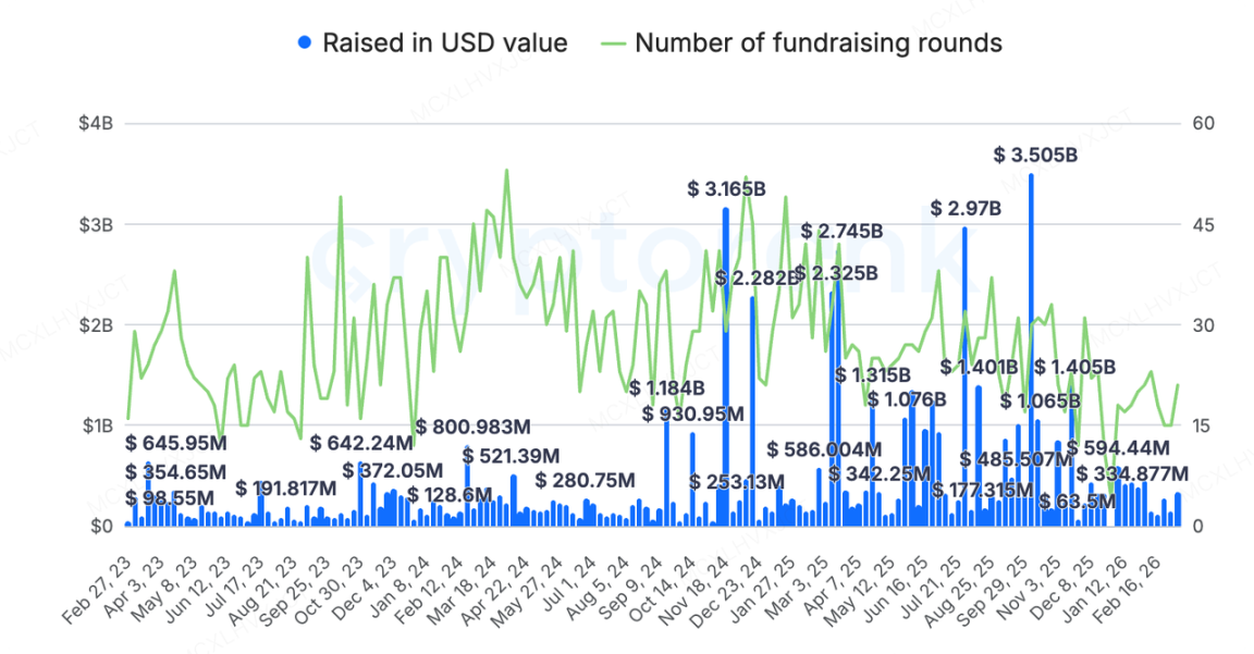 一级市场方面,CryptoRank 统计口径下,本周披露融资总额 $334M、共 21 起融资事件。资本流向依然呈现出结构性变化:资金持续向中后期和具备实际订单 / 市场需求的基础设施集中,早期纯叙事驱动的种子轮融资大幅缩水。布局“能扛住流动性收紧”的实用工具型与合规型项目,已成为当下 VC 的共识。