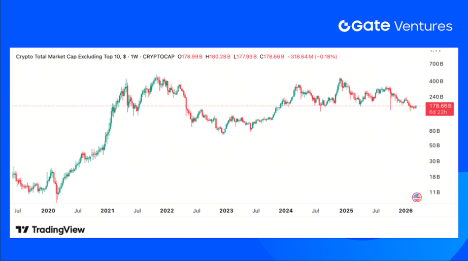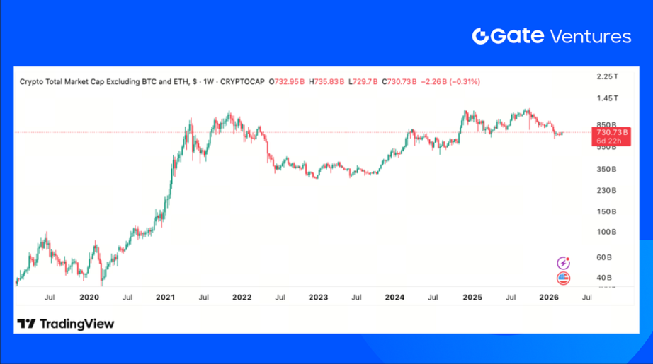 The total crypto market cap rose 9% last week. Excluding BTC and ETH, market cap increased 5.3%, while the broader altcoin market excluding the top 10 tokens by dominance gained 7%.