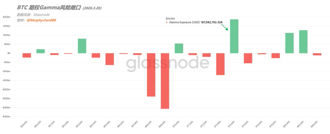 第三,期权结构正在为 75,000 美元制造磁吸效应。 加密分析师 Murphy 指出,3 月 20 日到期的期权在 74,000 美元附近存在约 1.8 亿美元的 Long Gamma 敞口,做市商的对冲行为会抑制波动,使价格倾向于在该区间震荡,客观上形成阻力。