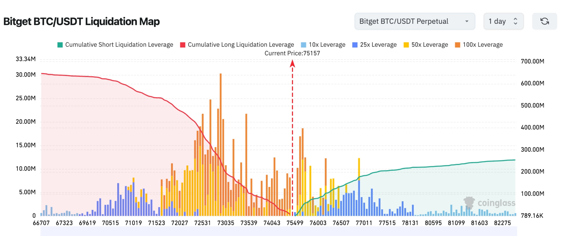 Bitget BTC/USDT 清算地图:当前价格约 75,200 美元,下方 72,000–74,000 美元区间聚集大量多头清算,若回踩该区域,可能触发多头连锁爆仓并加剧下行。上方 76,000–78,000 美元存在明显空头清算密集区,若价格继续上行,可能引发空头挤压并推动行情进一步上涨。
